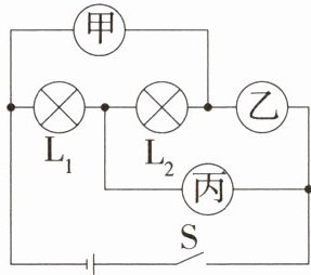 2. [2025山西临县期中]如图所示的电路中,甲、乙、丙是连接在电路中的三只电学仪表。闭合开关S后,灯$L_{1}$、$L_{2}$均正常发光。则(