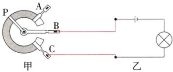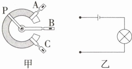 13. 如图为某种调光型台灯的电位器示意图,A、B、C 为三个接线柱,A、C 分别连在炭膜两端,B 为转动旋钮,P 为旋片,可随转动旋钮改变在炭膜(相当于一根电阻丝)上的位置。用笔画线将甲图连在乙图电路中,要求顺时针转动旋钮可使灯泡亮度减小。