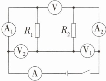 11. 如图,闭合开关后,三个电流表 A、$A_1、$$A_2$的示数分别为 I、$I_1、$$I_2,$电压表 V、$V_1、$$V_2$的示数分别为 U、$U_1、$$U_2,$则 I、$I_1、$$I_2$的关系是