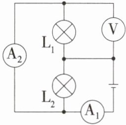 12. 如图所示的电路中,电压表示数为 4.5 V。$A_1、$$A_2$两表示数分别为 1.2 A、0.9 A,通过$ L_2$的电流为
