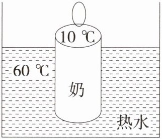 18. 「2025 湖北十堰期中」由于天气寒冷,吃早饭时妈妈要用热水给小明加热 $ 250g $ 瓶装牛奶,如图所示。要使这瓶牛奶的温度由 $ 10^{\circ}C $ 最终升高到 $ 50^{\circ}C $,水的比热容为 $ 4.2 × 10^3J/(kg \cdot ^{\circ}C) $,牛奶的比热容为 $ 2.1 × 10^3J/(kg \cdot ^{\circ}C) $,不计热量损失。