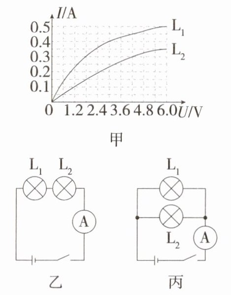 (1)图乙中,两灯泡串联,电流表测电路中的电流,电路中的电流为$I = 0.3A$,则通过两灯泡的电流均为0.3A;根据图甲可知,两灯泡两端的电压分别为$U_{1}=1.8V$、$U_{2}=4.2V$,根据欧姆定律可得两灯泡的电阻分别为$R_{1}=\frac{U_{1}}{I}=\frac{1.8V}{0.3A}=6Ω$,$R_{2}=\frac{U_{2}}{I}=\frac{4.2V}{0.3A}=14Ω$;
