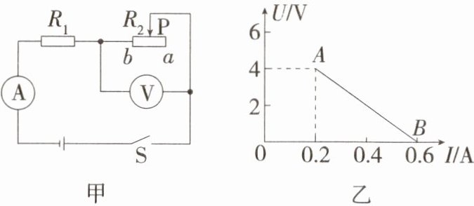 8. [2025山东潍坊期中, ](多选)如图甲所示,当闭合开关S,滑动变阻器滑片P从a端移到b端时,两表示数变化关系用图乙中线段AB表示$,R_1= 10Ω。$下列分析正确的是(