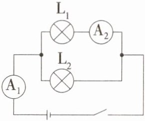 9. [2024山东滨州中考, ]如图所示,电源电压为3V,闭合开关后,电流表$A_1$的示数为0.6A,电流表$A_2$的示数为0.2A,则通过灯泡$L_2$的电流为