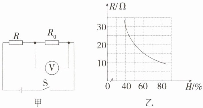 9.「2023山西中考」小伟给学校劳动实践基地的蔬菜大棚设计了一个测量空气湿度的电路图,如图甲所示。电源电压恒为6V,定值电阻R₀的阻值为20Ω,湿敏电阻R的阻值随空气湿度H的变化关系如图乙所示。下列分析正确的是(