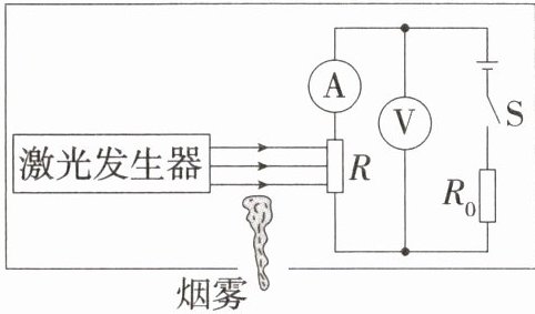 10.「2024河南南阳期中」(多选)如图所示,是房间中的烟雾报警器的简化原理图。内装有一个激光发生器及带有一光敏电阻R的电路,其中电源电压恒定,R₀为定值电阻。有烟雾产生时,激光被烟雾遮挡而使光敏电阻的阻值发生变化,从而改变电路中的电流。当电路中的电流增大至某一数值时报警器开始报警。下列说法正确的是(