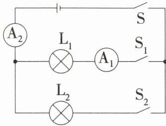6.C 闭合开关S、S₁和S₂,灯L₁和L₂并联,电流表A₁测通过灯L₁的电流,电流表A₂测干路电流,A错误;由并联电路中干路电流等于各支路电流之和知,电流表A₁的示数比电流表A₂的示数小,B错误;断开S₂,电路为L₁的简单电路,电流表A₂的示数与电流表A₁的示数相等,则电流表A₂示数变小,C正确;并联电路中,用电器互不影响,所以断开开关S₂,灯L₁亮度不变,D错误。故选C。