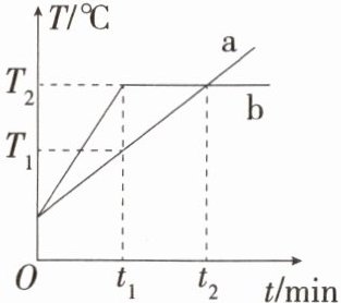 解析 由图可知,质量和初温相同的a和b吸收相同的热量后,a升温慢,则物质a的比热容大于物质b的比热容;在t₁~t₂时间内,物质b处于熔化阶段,吸收热量,温度不变,内能增加。