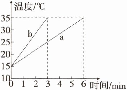 D 质量和初温相同的a、b两种液体,使用完全相同的电加热器对其加热,相同时间内两种液体吸收的热量相同,故0~3 min内,a、b液体吸收的热量相等,故C错误;由图可知,升高温度为Δt=35℃-15℃=20℃时,a液体加热了6 min,b液体加热了3 min,即a、b吸收的热量之比$\frac{Q_a}{Q_b}=\frac{2}{1}$,即升高相同的温度时,b液体吸收的热量少,故D正确;根据$c=\frac{Q}{m\Delta t}$可知,相同质量的不同物质,升高相同的温度,吸收的热量和比热容的大小成正比,即$\frac{Q_a}{Q_b}=\frac{c_a}{c_b}=\frac{2}{1}$,a液体的比热容大,故A、B错误。故选D。
