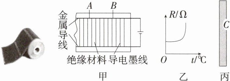电热膜是一种新型的电热器件,如图所示是一种常见的电热膜。电热膜是在绝缘的聚酯薄膜表面,经过特殊工艺加工形成的一条条薄的导电墨线,导电墨线两端与金属导线相连,形成网状结构,其内部结构如图甲所示。电热膜通电工作时没有发红、炽热现象产生,所以电热膜本身温度并不太高,不易氧化,使用寿命长。在制造电热膜时,会出现不同区域导电墨线厚度不均匀的现象,导电墨线电阻随温度变化的关系如图乙所示,这种温度特性的优点是它不会因厚度不均匀而出现严重发热不均、局部过热的现象,这是电热丝所不具备的,它保证了电热膜各处的温度均匀。