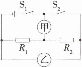 9. [2024四川广安中考]如图所示,电源电压恒定不变,甲、乙为两只相同的电表。当开关$S_1$闭合、$S_2$断开时,甲、乙两电表示数之比为5:3,则两电表均为____