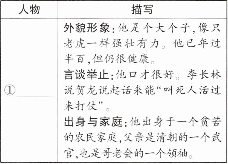 |①____|外貌形象:他是个大个子,像只老虎一样强壮有力。他已年过半百,但仍很健康。