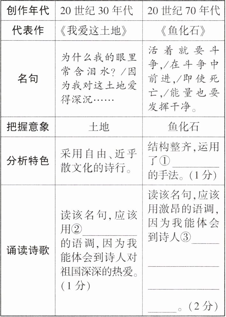 1. 名著阅读活动中,班级成立了“艾青诗歌研学小组”,小渝同学邀请你参加活动,他们认为读诗要把握意象、分析特色,下面是该研学小组的成果展示,请你帮同学们完成表格内容。(4分)
