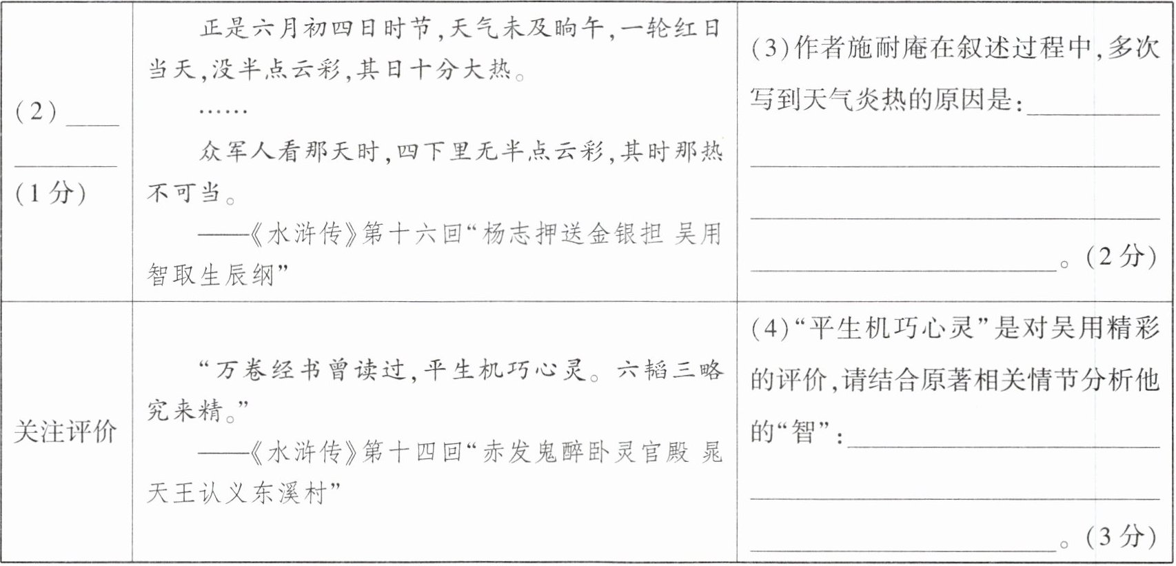 ——《水浒传》第十六回“杨志押送金银担 吴用智取生辰纲”|(3)作者施耐庵在叙述过程中,多次写到天气炎热的原因是:____。(2分)|