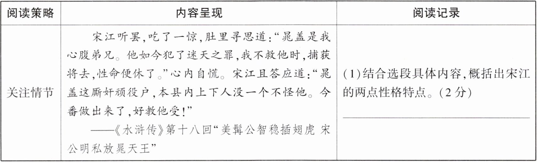 ——《水浒传》第十八回“美髯公智稳插翅虎 宋公明私放晁天王”|(1)结合选段具体内容,概括出宋江的两点性格特点。(2分)