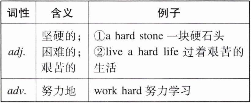|adj.|坚硬的;困难的;艰苦的|①a hard stone 一块硬石头