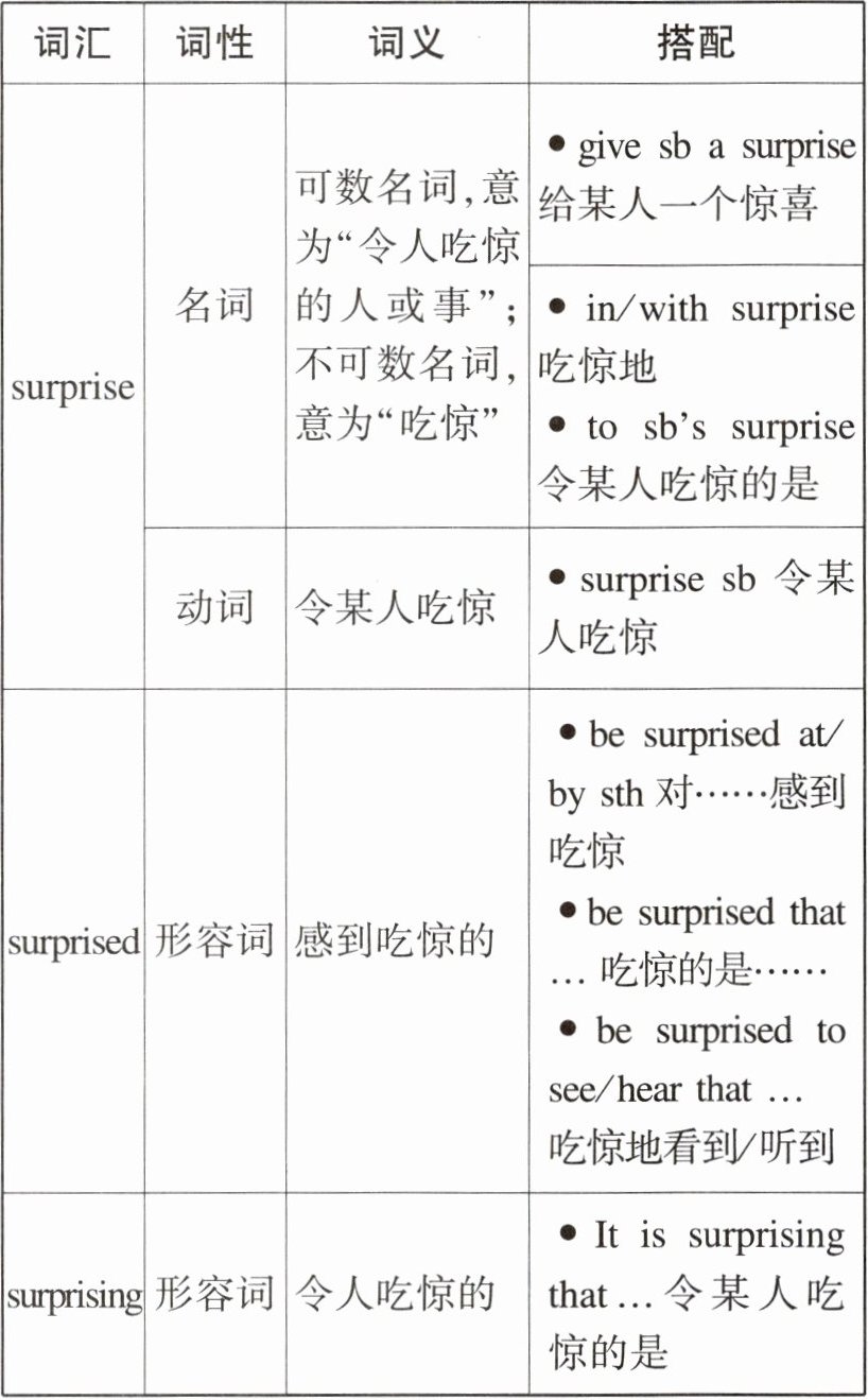【探究】surprised 意为“感到惊讶的”,surprising 意为“令人惊讶的”。常见搭配如下: