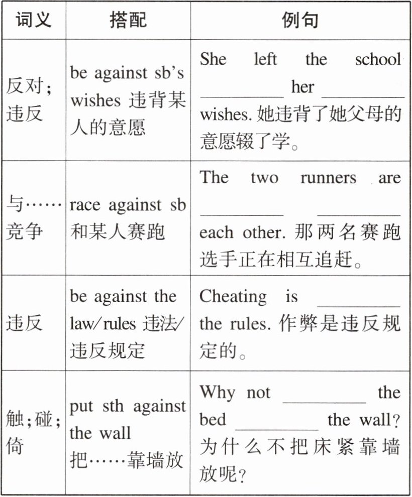 |触;碰;倚|put sth against the wall 把……靠墙放|Why not \_\_\_\_\_\_ the bed \_\_\_\_\_\_