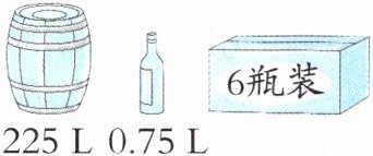 1. 葡萄酒从国外运输到国内时,一般装在大桶里运输,到了国内后再灌装到酒瓶里进行运输或销售。如图所示,一桶葡萄酒能装多少箱?
