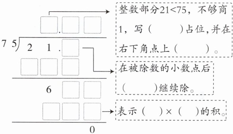 0.28 [点拨]因为21除以75不够商1,所以要在商的个位上用0占位,并在0的右下角点上小数点,同时也要在被除数的右下角点上小数点,添0继续除。