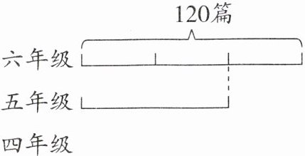 4. 新考法图文转换法 春风小学组织“书香校园读书月”征文活动,六年级上交了120篇作文,五年级上交的篇数是六年级的$\frac{2}{3}$,四年级上交的篇数是五年级的$\frac{3}{5}$。四年级上交了多少篇作文?(先把线段图补充完整,再解答)