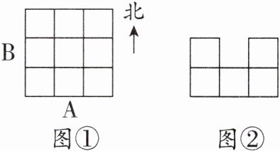 6. 新思维 空间推理 在图①中摆放大小一样的小正方体,每个空格中至少放一个。当你站在A处向正北方向看时,站在B处向正东方向看时,看到的形状都如图②所示,这个几何体至少是由多少个小正方体搭成的?