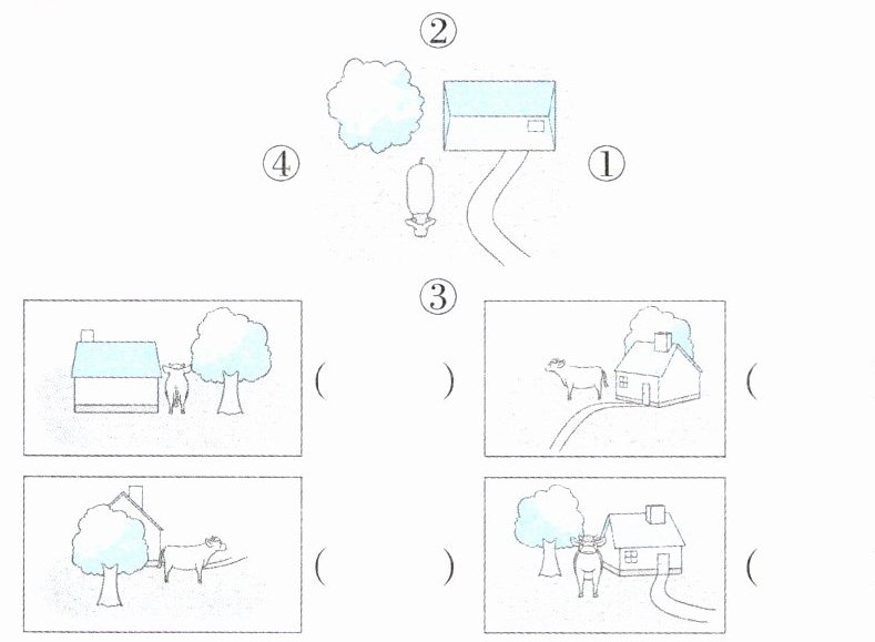 2. 同同沿着一条乡间小路自西向东逆时针走过,她在途中拍摄了四张照片,在这四张照片下面用①②③④标出拍摄的先后顺序。