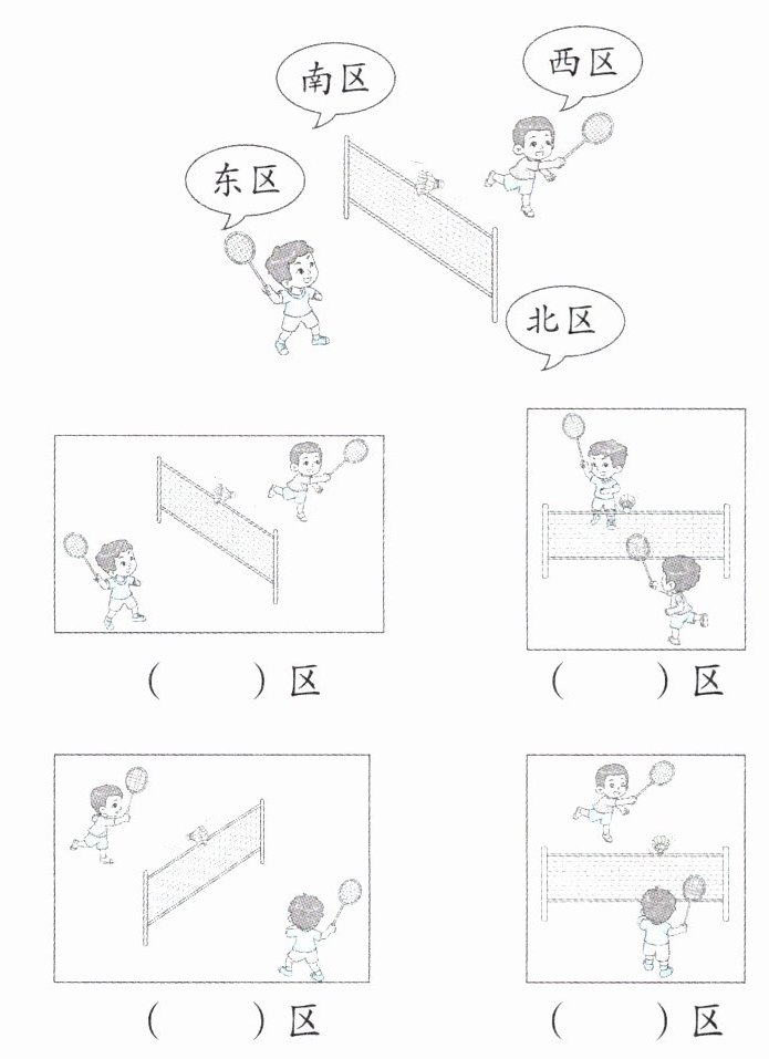 1. 下面是小记者蓝蓝拍摄的羽毛球比赛的四张照片,请标岀分别是在哪个区拍到的。