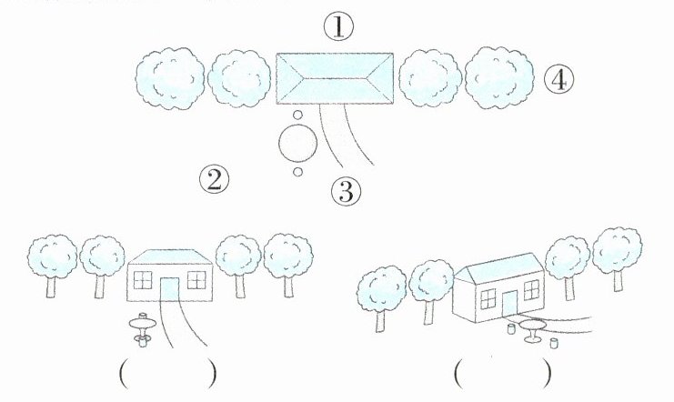 5. 新情境无人机 如图是无人机从空中拍到的一幅画面,房子两侧各有两棵树,门前的空地上有一个小圆桌。下面两张照片分别是站在哪个位置上拍摄的?(填序号)