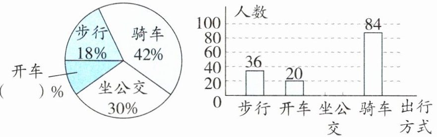 [点拨]由扇形统计图得开车的占总人数的1−18%−42%−30%=10%;由条形统计图得坐公交车的人数为200−36−20−84=60(人)。