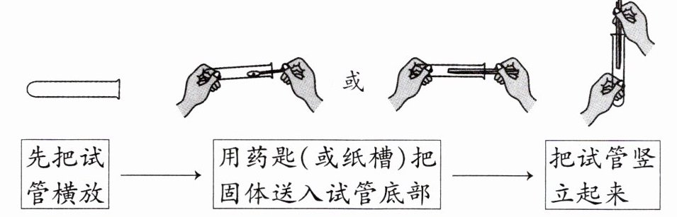 ,步骤:一横、二送、三竖立。向试管中加入粉末状试剂