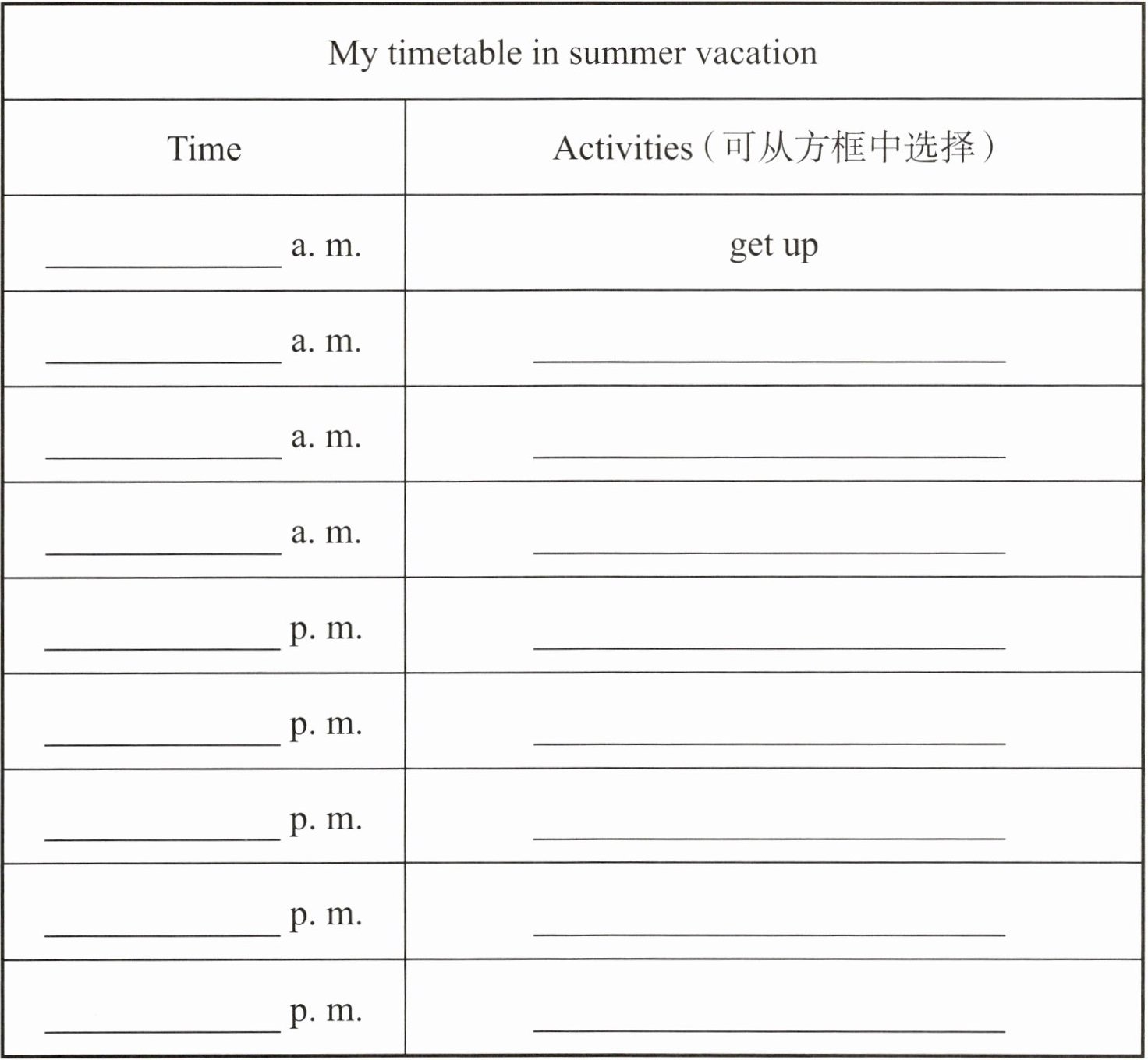 一、愉快的暑假生活开始了,请给你的暑假制作一个时间表(timetable)。