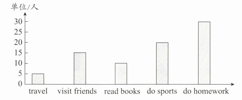 一、Lucy对班内同学的暑假规划做了一个调查。请根据下面的统计图,填写单词或短语,帮她完成调查总结吧!