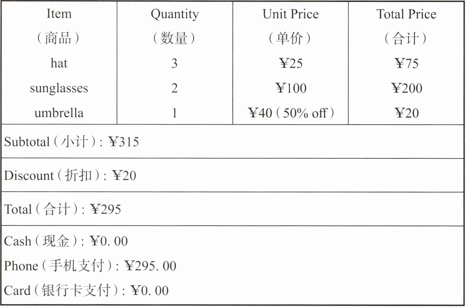 三、Anna今天去超市购物为假期出游做准备。请根据她的购物小票信息,选择正确的答案。