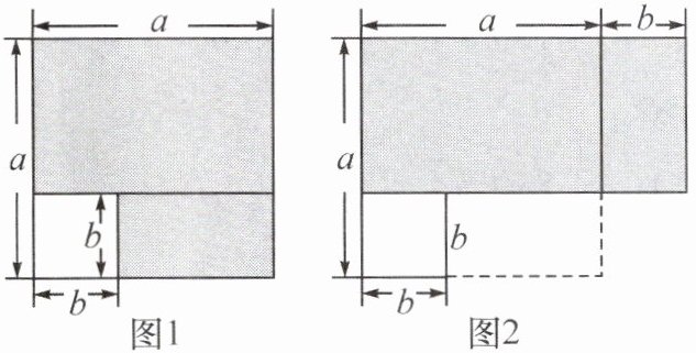 16. (石家庄外国语校本经典题)$(2023·南阳实验学校月考)$【探究】如图 1,从边长为$a$的大正方形中剪掉一个边长为$b$的小正方形,将阴影部分沿虚线剪开,拼成图 2 的长方形。
