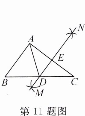 11. (2023·天津)如图,在$ \triangle ABC $中,分别以点$ A $和点$ C $为圆心,大于$ \frac{1}{2}AC $的长为半径作弧(弧所在圆的半径都相等),两弧相交于$ M $,$ N $两点,直线$ MN $分别与边$ BC $,$ AC $相交于点$ D $,$ E $,连结$ AD $. 若$ BD = DC $,$ AE = 4 $,$ AD = 5 $,则$ AB $的长为(