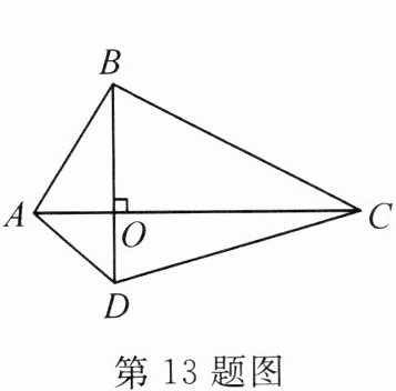 13. (2024·郑州巩义市期末)对角线互相垂直的四边形叫做“垂美”四边形. 现有如图所示的“垂美”四边形$ ABCD $,对角线$ AC $,$ BD $相交于点$ O $. 若$ AD = 2 $,$ BC = 4 $,则$ AB^{2} + CD^{2} = $