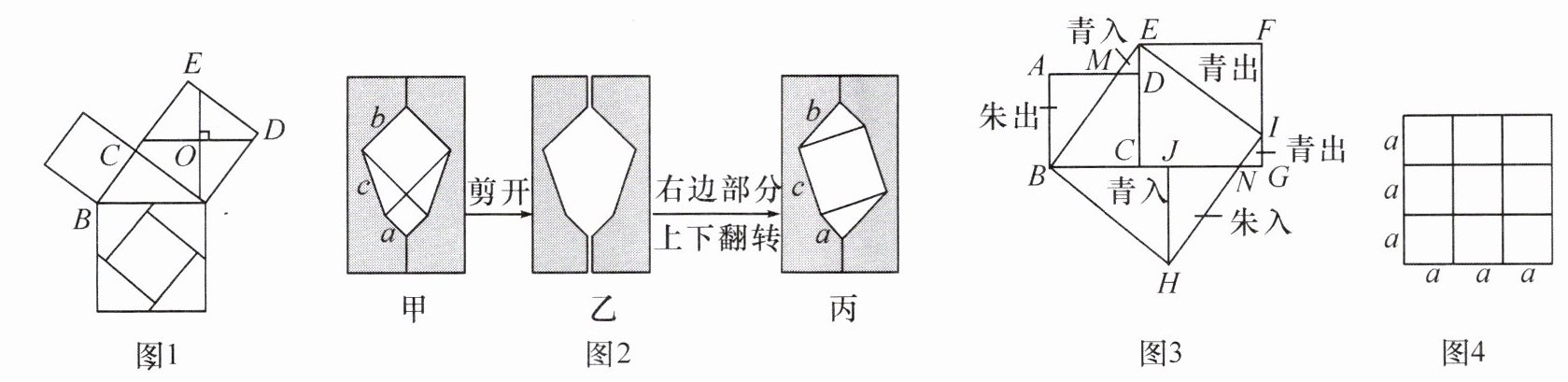 在勾股定理的学习过程中,我们已经学会运用一些几何图形验证勾股定理. 图 $1$ 是古印度的一种证明方法:过正方形 $ADEC$ 的中心 $O$ 作两条互相垂直的直线,将正方形分成 $4$ 份,所分成的四部分和一小正方形恰好能拼成一个大正方形. 这种方法,不用运算,单靠移动几块图形就直观地证明了勾股定理,这种根据图形直观推断或验证数学规律和公式的方法,简称为“无字证明”.