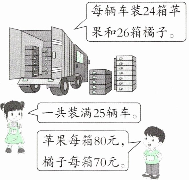 (1)求共有多少箱水果,可以先分别求出25辆车装有多少箱苹果和多少箱橘子,再求和;也可以先求出一辆车一共装多少箱水果,再求出25辆车一共装有多少箱水果。