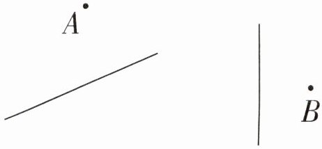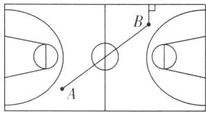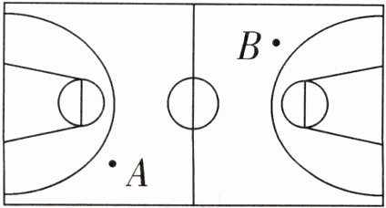 7. 标准的篮球比赛场地是一个长方形的坚实平面。淘气在篮球场打篮球,他在点A处,到点B处拿篮球后要尽快离开篮球场。请你设计出最短路线并在图中画出来。