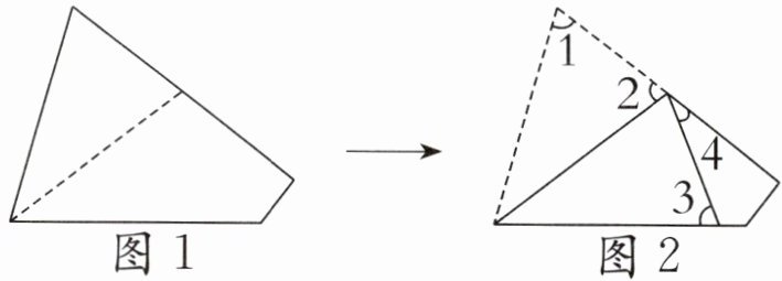 ∠3=∠1=68° ∠4=180°-75°-75°=30°【提示】本题考查平面图形的折叠性质。折叠后,图2中的∠1和∠3是对应角,它们大小相等,即∠3=∠1=68°;根据折叠后的图形可知,2×∠2+∠4=180°,因此∠4=180°-∠2-∠2=180°-75°-75°=30°。