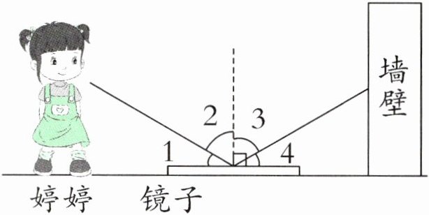 5. 爱做实验的婷婷发现,手电筒射出的光照在地面的镜子上后会反射到对面的墙壁上。如下图,$∠1= 30^{\circ },$$∠1= ∠4$,你能分别算出$∠2,∠3,$$∠4$的度数吗?
