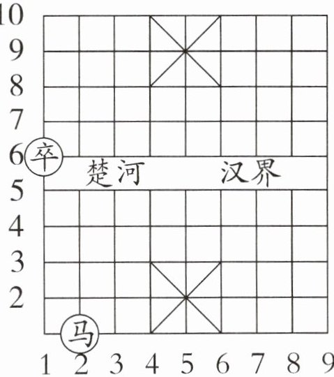 例 中国象棋是中华民族珍贵的文化遗产,其中“马”走的是“日”字格,可以向八个方向跳。如下图,现在“马”的位置是$(2,1)$,它想吃掉$(1,6)$位置的“卒”,最少要走多少步?请在图中画出一种走法,并用数对标出“马”走过的各个点的位置。