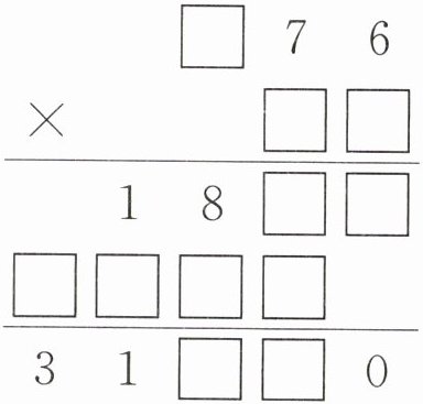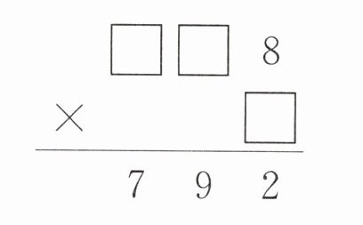 【提示】已知第一个乘数的个位上的数字是8,积的个位上的数字是2,可推出第二个乘数可能是4或9;因为积的百位上的数字是7,所以9不符合题意,因此第二个乘数只能是4,此时第一个乘数只能是198。