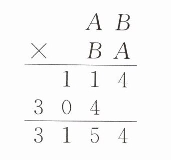 【提示】AB×A=114,AB×B=304,可知“B×B”的积的末位是4,“A×B”的积的末位也是4,B可取2或8,对应的A可取2,7或3,8。因为A≠B,所以对应组合应为A是7,B是2或A是3,B是8,72×27=1944,38×83=3154,因此A是3,B是8,A+B=3+8=11。