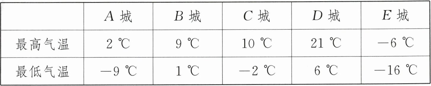 (2)E -16 【提示】因为-16℃<-9℃<-2℃<1℃<6℃,所以E城的最低气温最低。