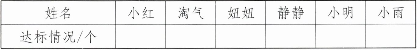 2. 学校举行“创业模拟”游戏,乐乐摆摊套圈,有六名同学参加了套圈,六名同学的套圈成绩如下:小红19个、淘气22个、妞妞33个、静静28个、小明37个、小雨24个。规定25个为达标,记作0个。超过达标的个数用正数表示,不达标的个数用负数表示,请完成下面的统计表。