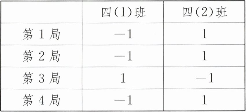 3. 实验小学四(1)班和四(2)班开展乒乓球对抗赛,比赛规则是“七局四胜”制。计分规则:胜1局,计1分;输1局,计-1分。