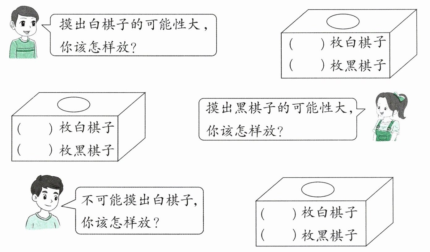 1. 在下面每个盒子里各放8枚大小相同的棋子(棋子有黑、白两种颜色),任意摸出1枚。