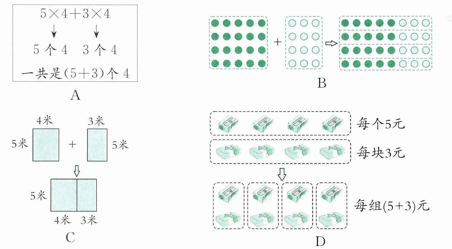 6. 下面例子不能说明等式5×4+3×4= (5+3)×4成立的是(